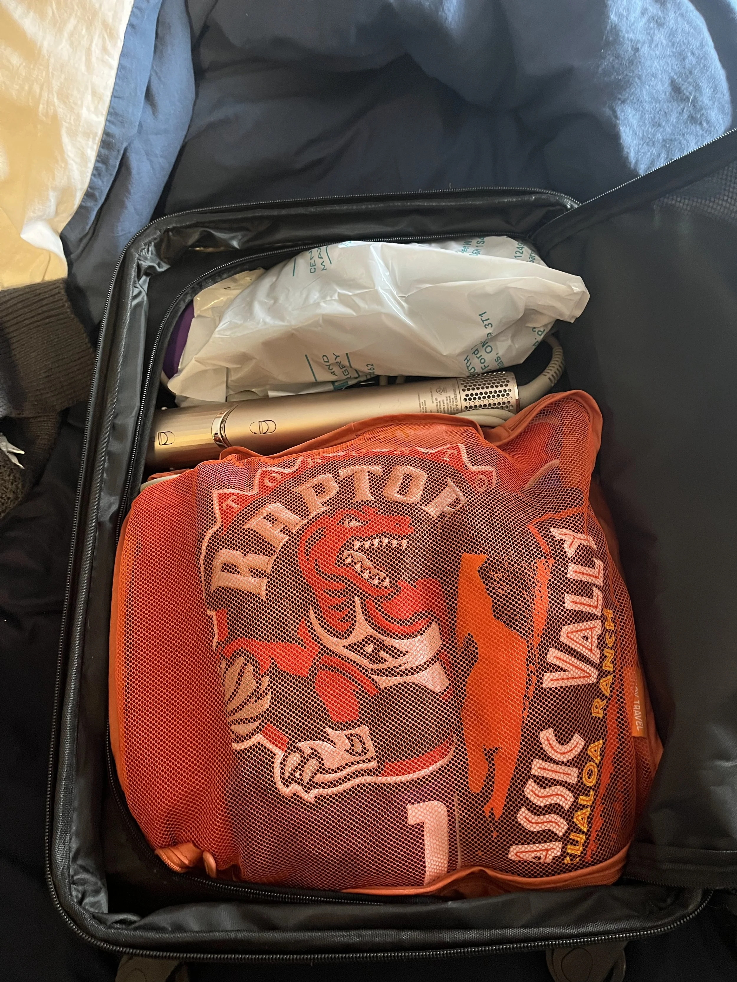 My beach towel, microfiber towel, and toiletry bag always stay close to the top — easy access, zero stress.