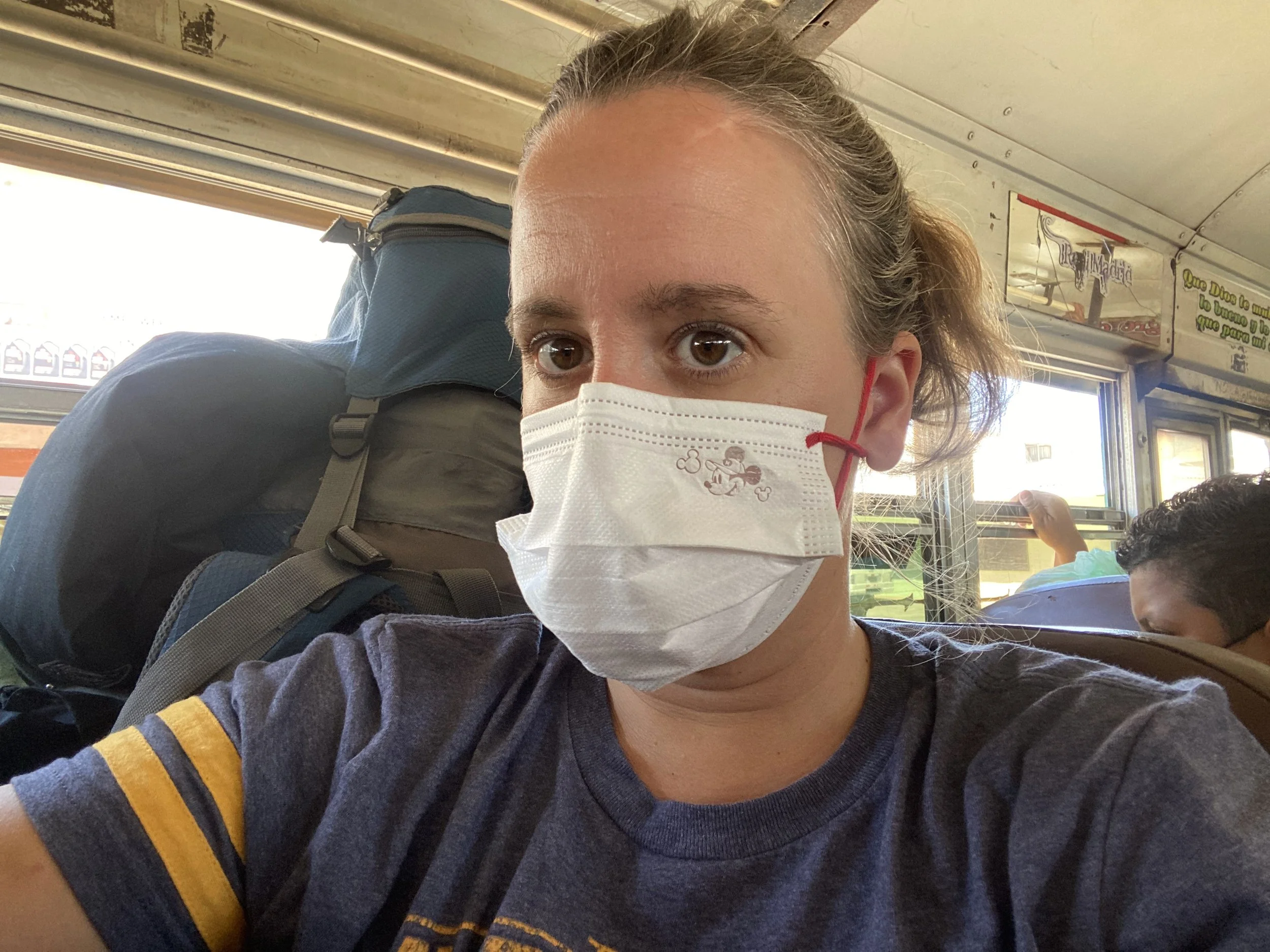 On the local bus to Lake Coatepeque — big backpack, no rush, and that familiar “here we go again” feeling.