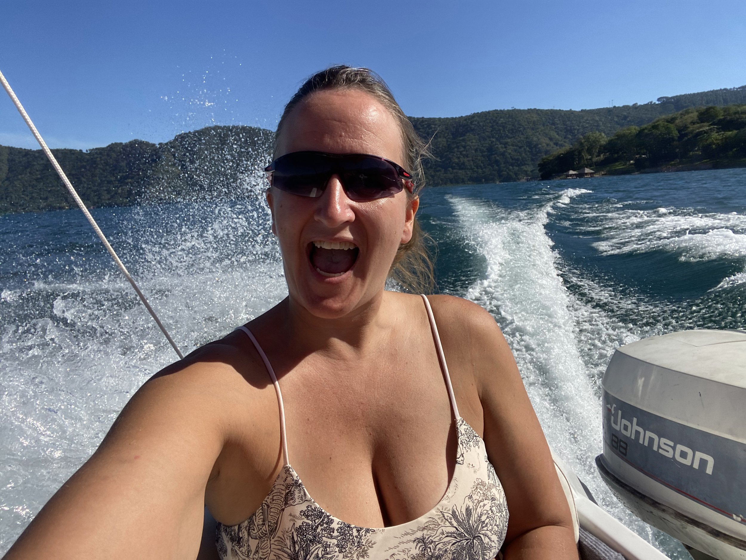 I sat at the back of the boat — partly not wanting to impose, partly just happy to watch the lake stretch out behind us.