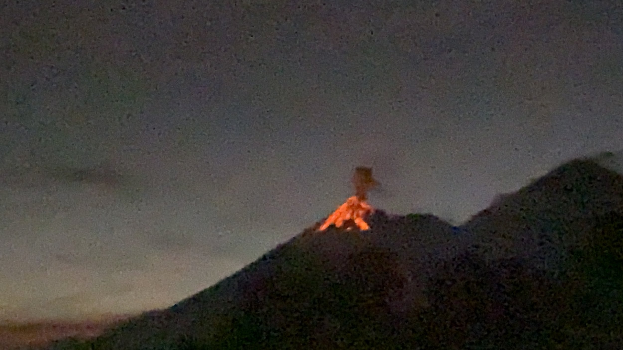Not the clearest photo, but this is exactly what Fuego looks like from Antigua — glowing lava lighting up the night sky.