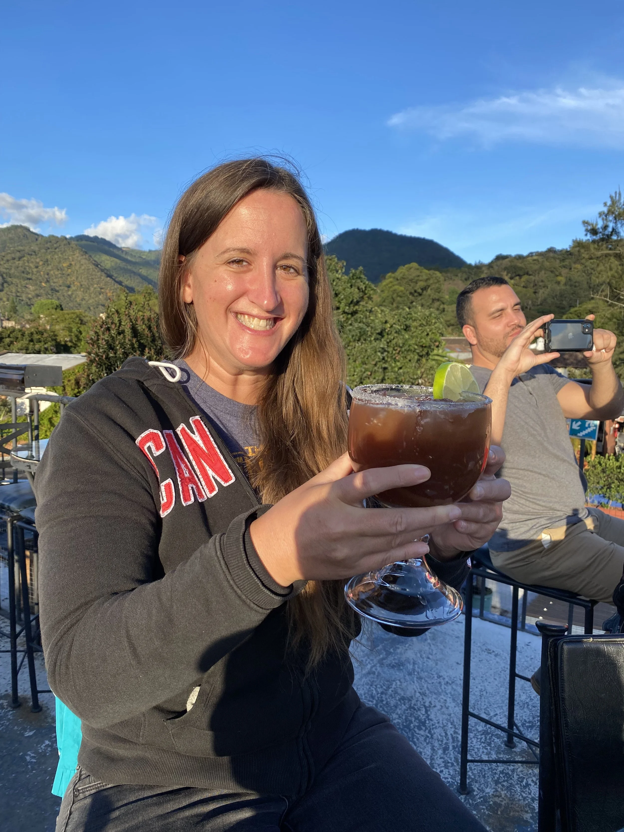 Solo travel win: a giant drink, a mountain view, and zero awkwardness being out alone. Guatemala makes going solo feel totally natural.
